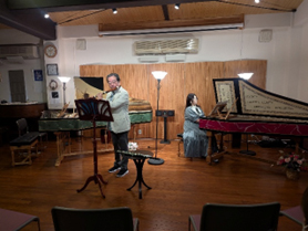<ピッチの違うチェンバロで演奏し、香取先生のアドバイスをもらっています>
