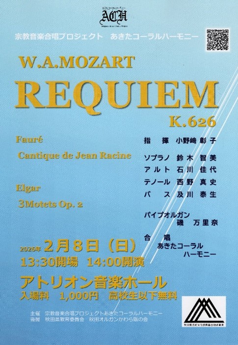 秋田でモーツァルトのレクイエムを歌いたいと集まった合唱団「秋田コーラルハーモニー」のコンサートです。全曲パイプオルガン伴奏にてアトリオン音楽ホールで開催です。磯が夜な夜なオルガン練習に励んでおります。ぜひぜひ会場にてお待ちしております。チケットお問い合わせは秋田コーラルハーモニーのホームページか磯(090-7072-4384)へお願いいたします。