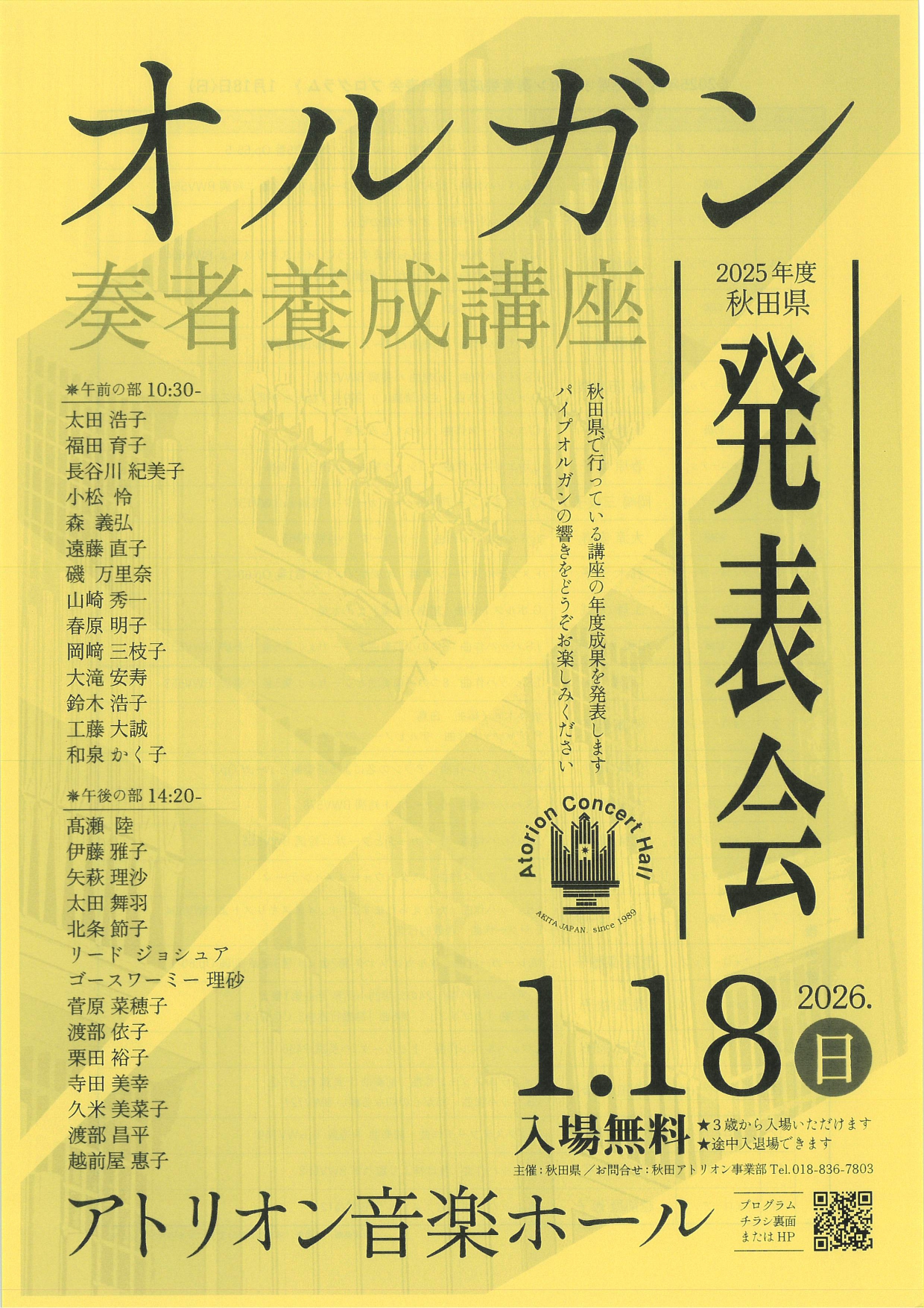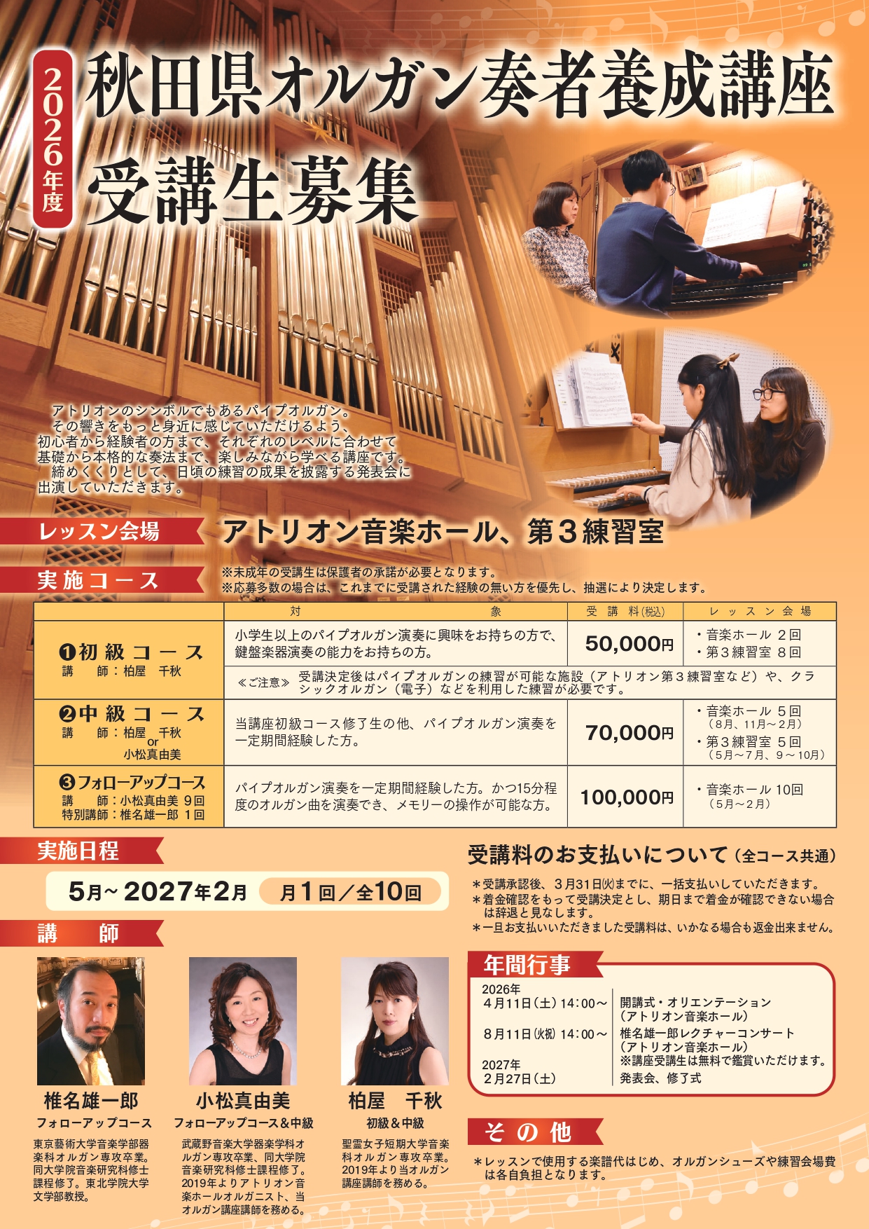 毎年講座を開講している秋田県が来年度の募集を始めました。詳細は下記の通りです。初めての方も、またオルガン弾きたいと言う方も、アトリオンのオルガンを弾く大チャンスですのでこの機会をお見逃しなく!
